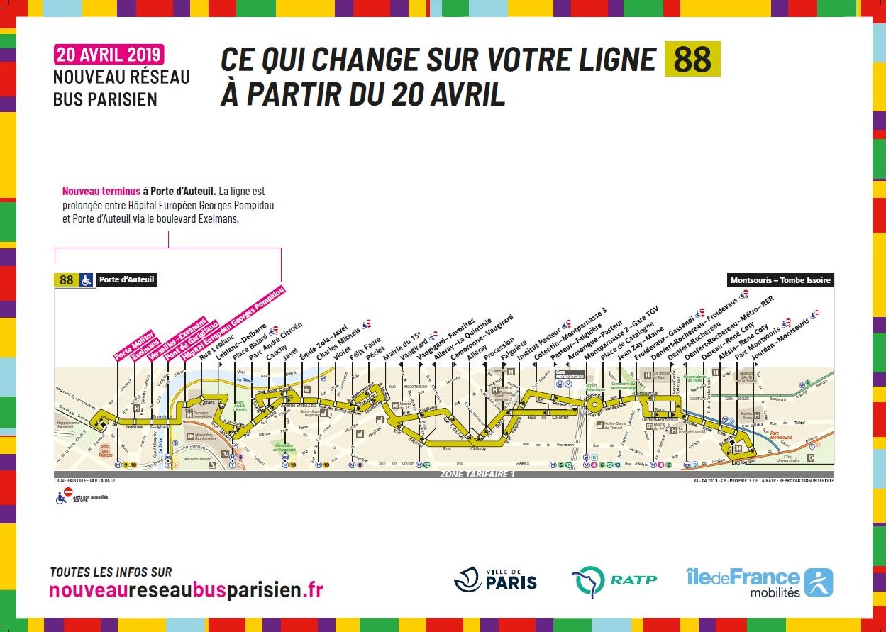 La ligne 88 est prolongée via le boulevard Exelmans jusqu'à Porte d'Auteuil.