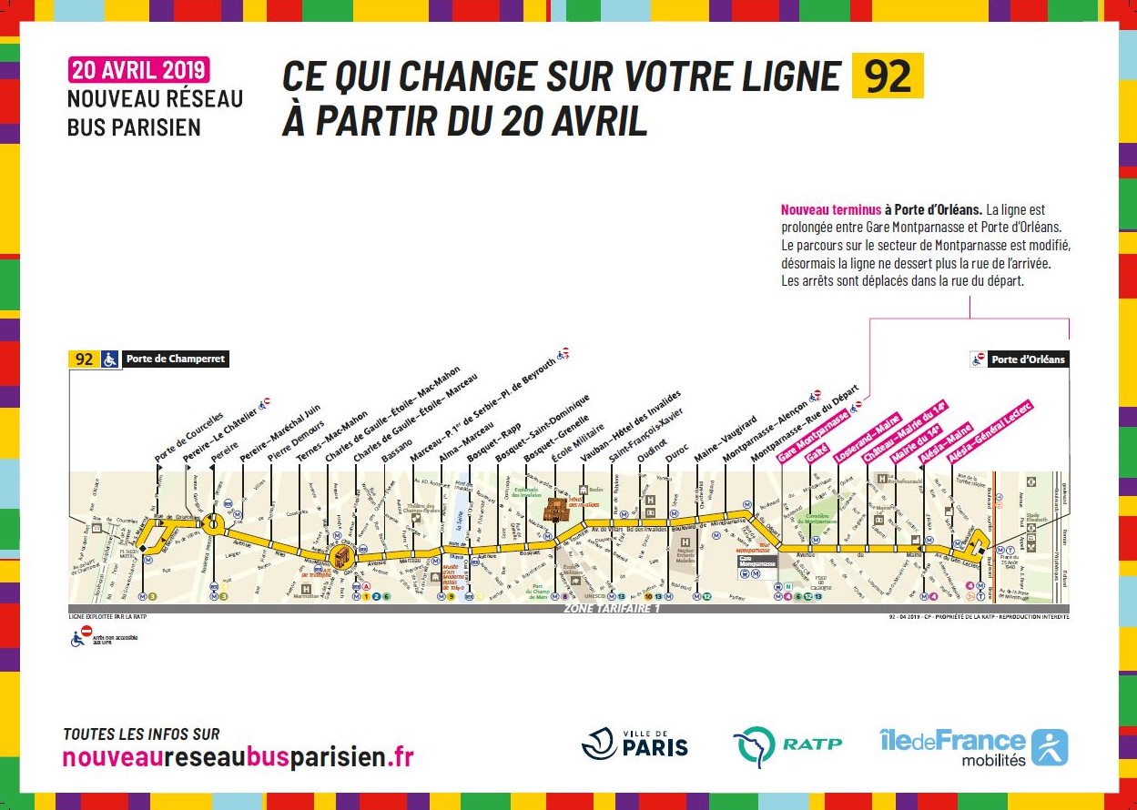 La ligne 92 est prolongée entre Gare Montparnasse et Porte d'Orléans (elle reprend l'ancien itinéraire du bus 28)