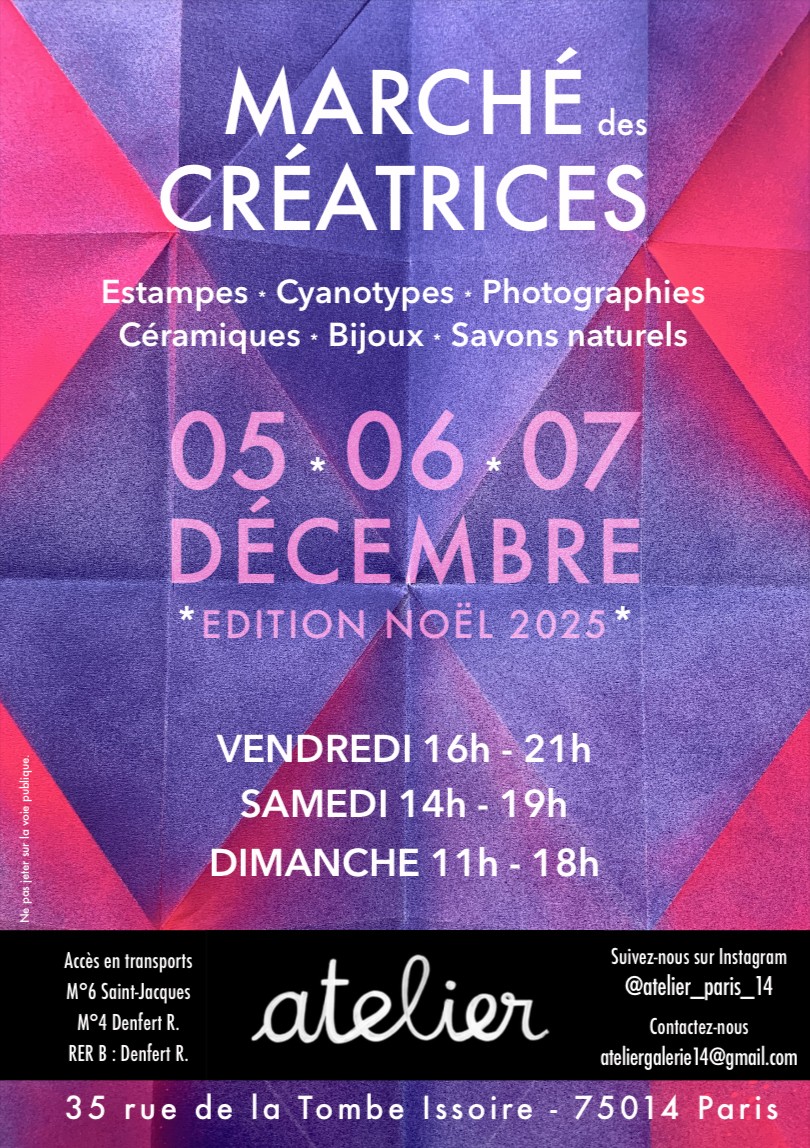 Le nouvel espace L'Atelier accueille 5 artistes, artisanes : Baba savonnier et ses magnifiques savons naturels made in Paris 14, Laure Debadier créatrice de délicates perles en verre de Murano, Mathilde Lenhard présente une subtiles série de dessins à l’encre, Anne Roffet crée des bijoux épurés pensés comme des œuvres graphiques, Christine Duchier Lapeyre réalise des céramiques décoratives dont les émaux sont issus de recherches personnelles, et puis notre travail personnel à Astrid Kervella, Cora Texier et Stéphanie Rivray avec des estampes, photographies, cyanotypes.