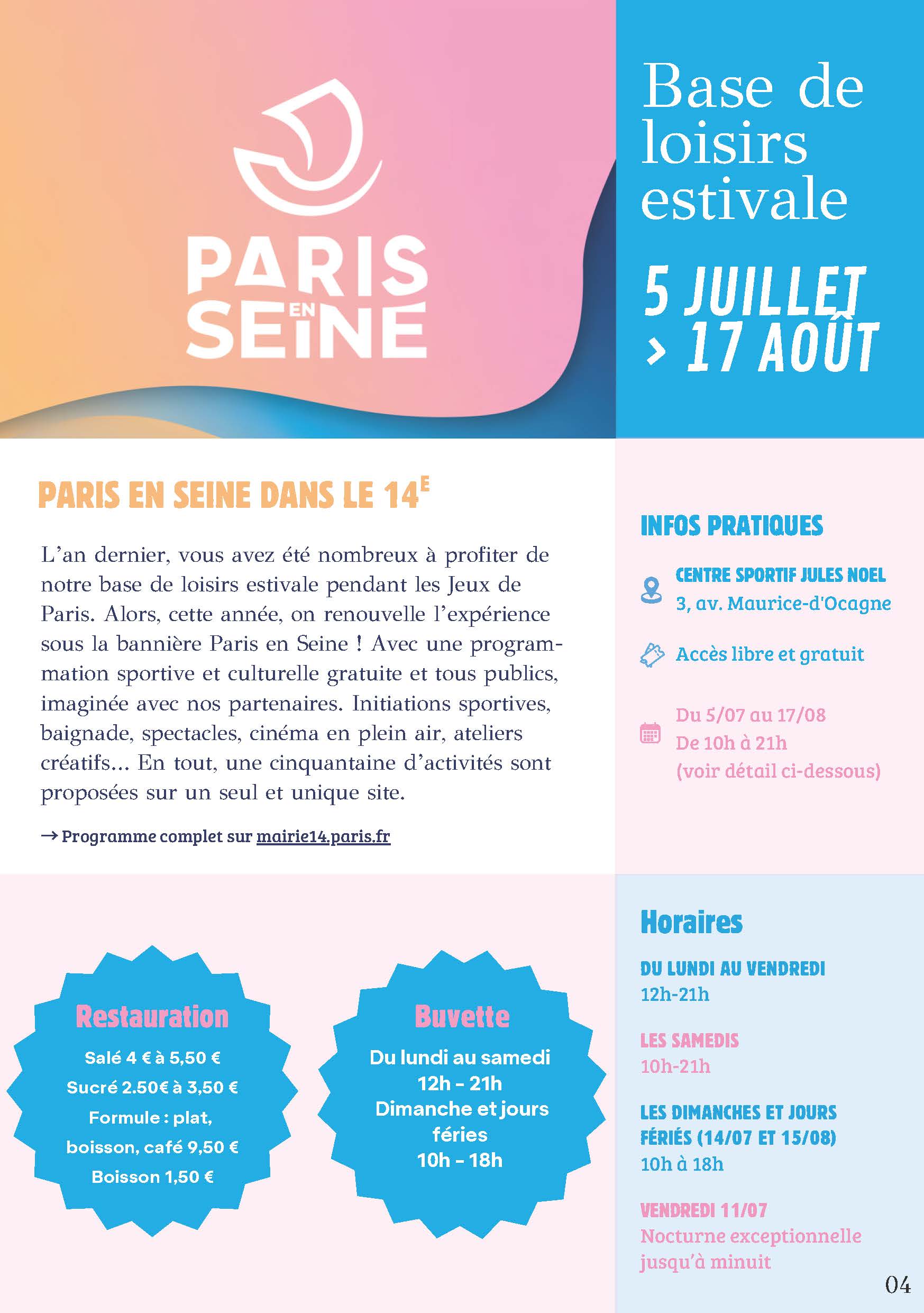 Découvrez le programme complet des animations de votre base de loisirs estivale également dans votre Agenda du 14e ou sur Que faire à Paris.